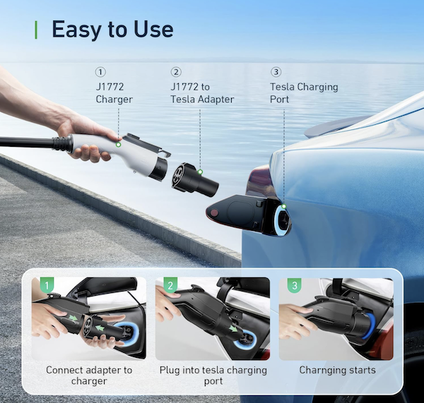 Solo conecta el adaptador a la estación J1772 y luego al Tesla para comenzar la carga de inmediato. Perfecto para el hogar, viajes o emergencias .