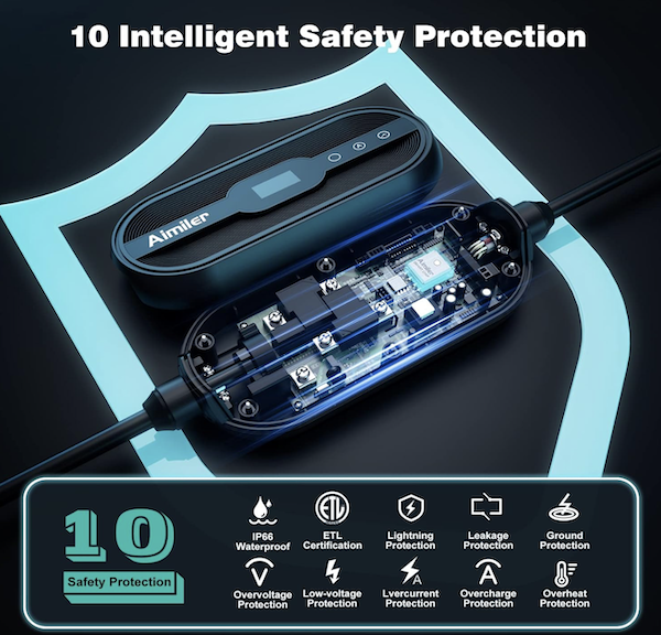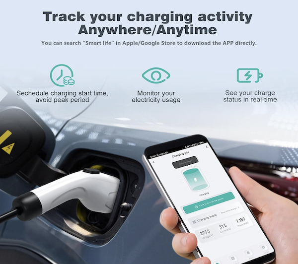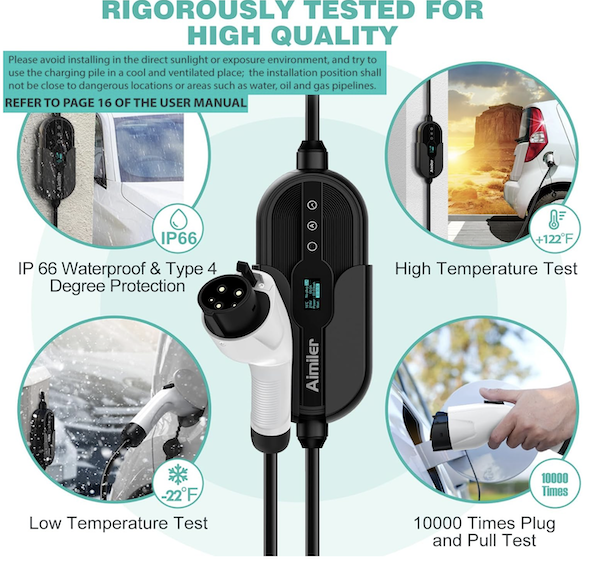 Salida: conector SAE J1772, compatible con la mayoría de EV, e incluye adaptador para cualquier vehículo que necesite.